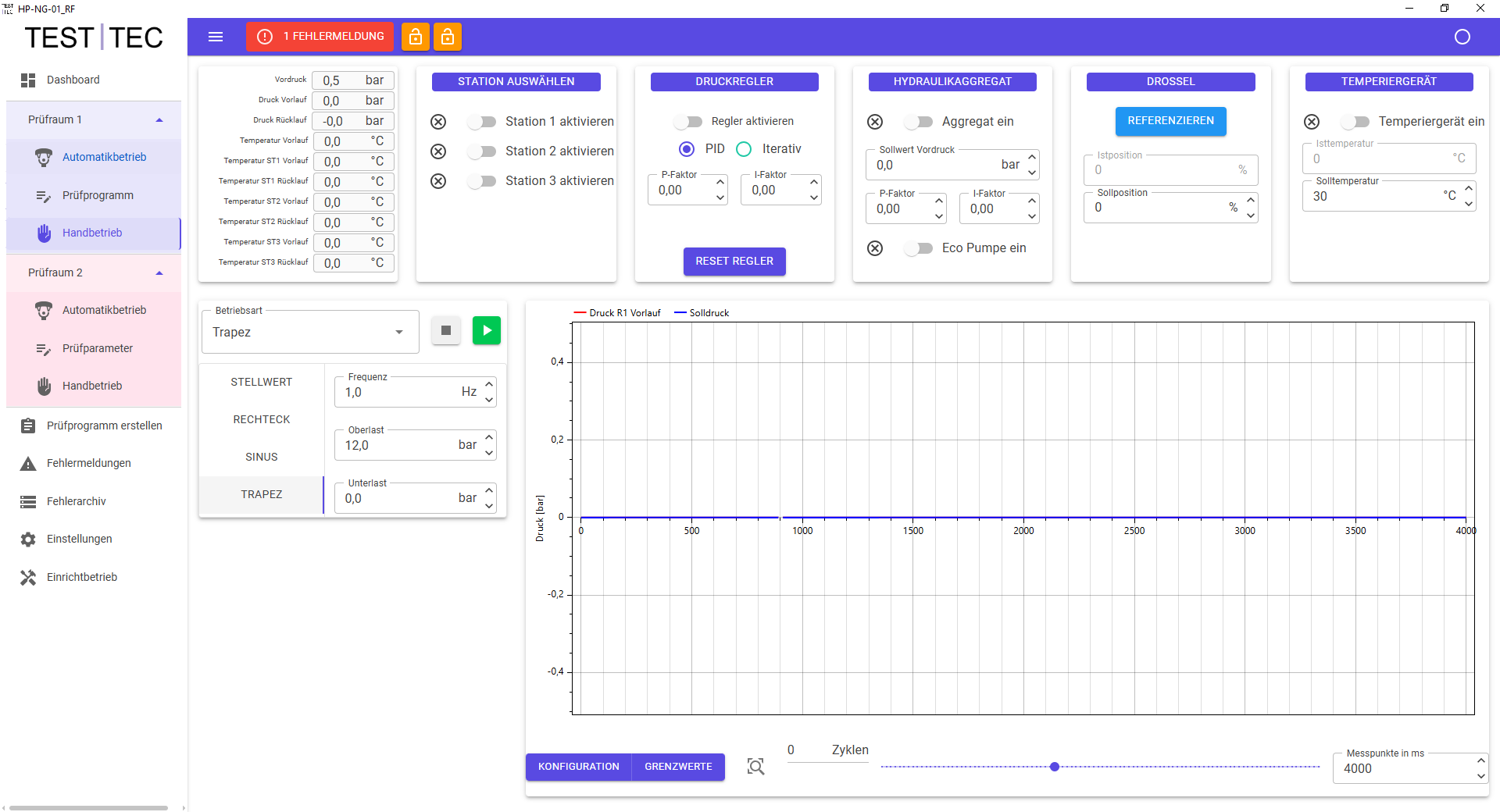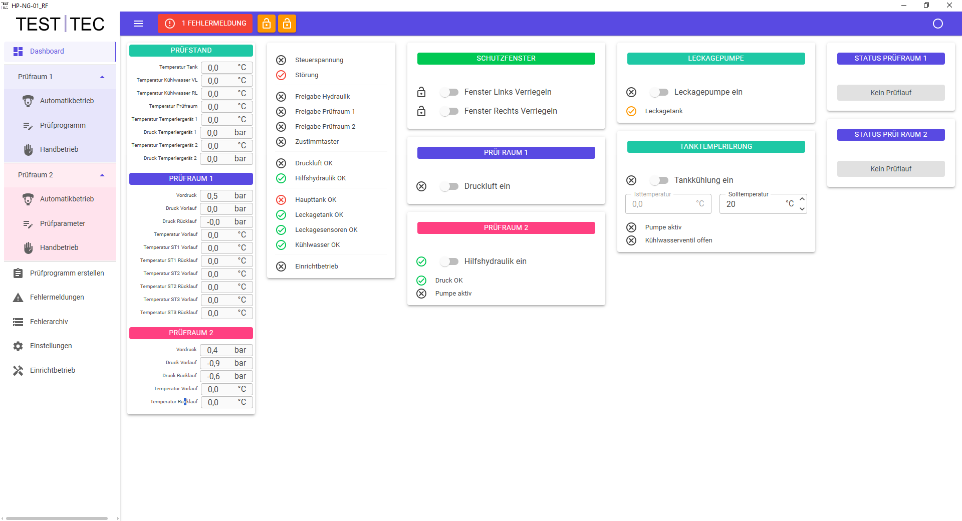 Die Prüftechnik jeder Kammer ist mit einem iterativen Regelsystem ausgestattet. Pro Prüfkammer kommen zwei Drucksensoren (Vorlauf und Rücklauf) zum Einsatz. Die Druckregelung erfolgt über die Sensoren wahlweise in der Vorlauf- bzw. der Rücklaufleitung